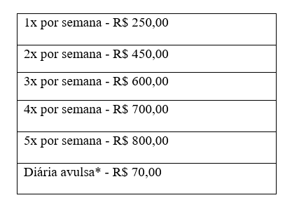 * As diárias avulsas deverão ser contratadas diretamente com a professora do contraturno, mediante pagamento antecipado na secretaria. As vagas estarão sujeitas à disponibilidade do dia.